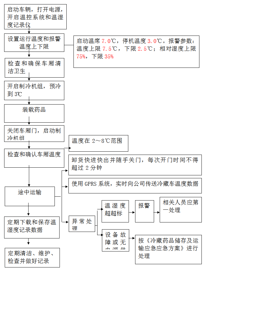 2、運輸冷藏藥品時,應事先發出運行通知,標明運行方式、線路、運輸人員、異常情況處理方案等事項。